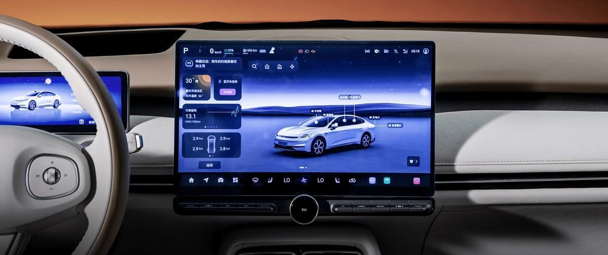 内饰方面,启源A06并没有太多的自身特色,配备10.17英寸液晶仪表和15.6英寸的悬浮式中控屏,内置MTK8676芯片,并且还提供可外接的物理按键以及后排PAD支架。