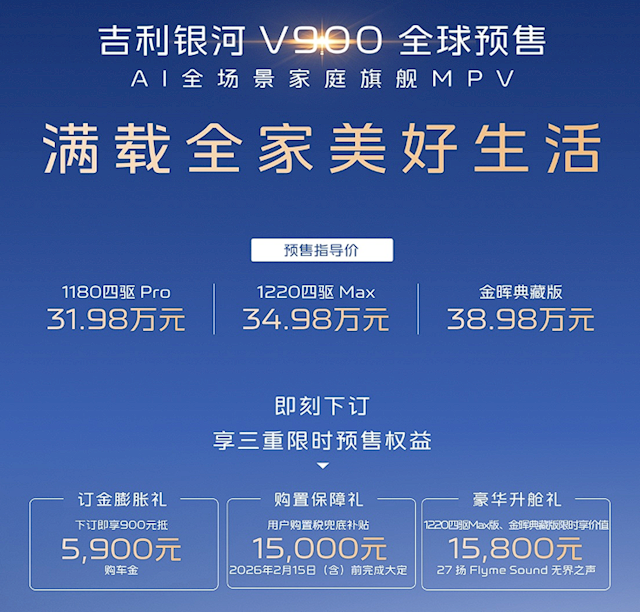 快科技1月7日消息,吉利银河混动MPV车型V900开启预售,共推出3款车型,预售价区间为31.98-38.98万元。