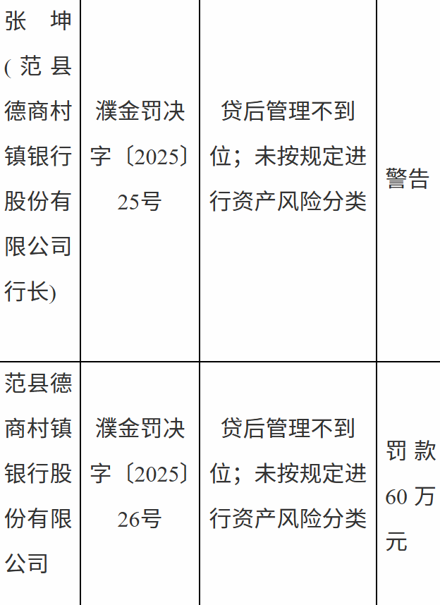 1月19日,国家金融监督管理总局濮阳监管分局行政处罚信息公示表显示,范县德商村镇银行股份有限公司因贷后管理不到位;未按规定进行资产风险分类被罚款60万元。责任人张某被警告。